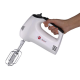 .خصوصيات عملكردی :- بدنه اصلی از جنس ABS( سفید) مجهز به:• کاسه استیل دارای دنده برای چرخش در حین عملکرد• کلید کنترل سرعت( 5 حالت از 1 تا 5 )و خاموش مشترک با دکمه Eject چنگک ها (Eject :قابل استفاده فقط در حالت خاموش)• دکمه Turbo برای افزایش سرعت 1 تا 5 محصول به صورت لحظهای با کمی بیش از سرعت انتخاب شده؛ طبق توصیه دفترچه راهنما، حداکثر زمان استفاده از حالت Turbo؛ ،30s لحاظ شده است./- دارای 2 عدد چنگک خمیرزن (چنگک مجهز به چرخدنده و رینگ پلاستیکی و چنگک مجهز به رینگ فلزی یکپارچه با چنگک) برای خمیرهای غلیظ و 2 عدد چنگک تخم مرغ زن(چنگک مجهز به چرخدنده و رینگ پلاستیکی و چنگک مجهز به رینگ فلزی یکپارچه با چنگک) برای همزدن تخم مرغ، خمیر کیک (چنگک های مجهز به رینگ فلزی باید روی سوراخ بزرگتر نصب شود.)