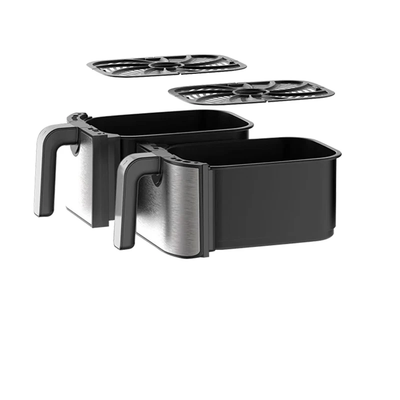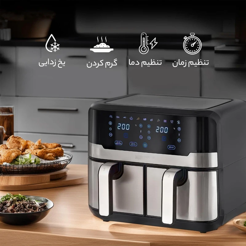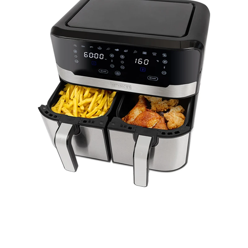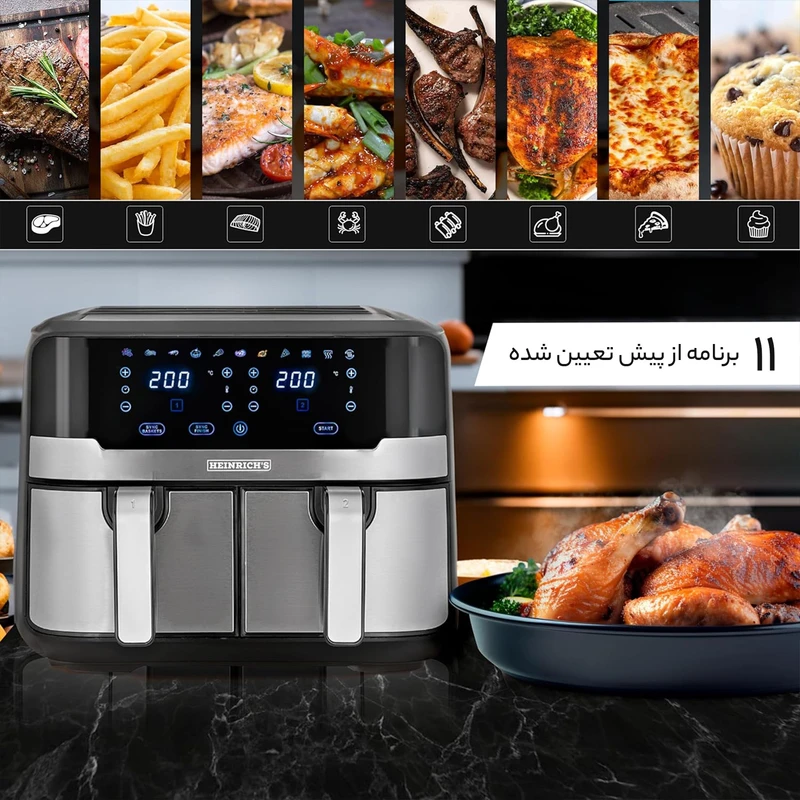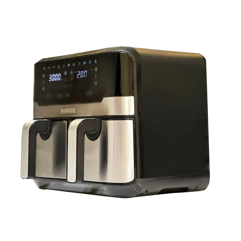 سرخکن دوقلو هنریچ یکی از بهترین و با کیفیت ترین سرخکن های دوقلو در بازار بوده و به دلیل استفاده مجزا از هر مخزن این امکان را فراهم میسازد تا کاربر بتواند به طور همزمان دو ماده غذایی مختلف را داخل دستگاه قرار داده و پخت نماید. ظرفیت هر مخزن دستگاه 4.5 لیتر بوده و در مجموع 9 لیتر می باشد. این دستگاه دارای نمایشگر دیجیتال حرفه ای با 11 منوی پخت می باشد. صفحه کلید تاچ بسیار با کیفیت این دستگاه فرمان شما را به راحتی اجرا می نماید. این دستگاه دارای دو صفحه گریل جهت سرخ کردن و گریل کردن مواد غذایی می باشد. این دستگاه قابلیت خشک کردن میوه و سبزیجات را به دلیل داشتن ترموستات حرارتی با کیفیت که از 40 درجه تا 220 درجه حرارت تولید می کند را دارا می باشد.